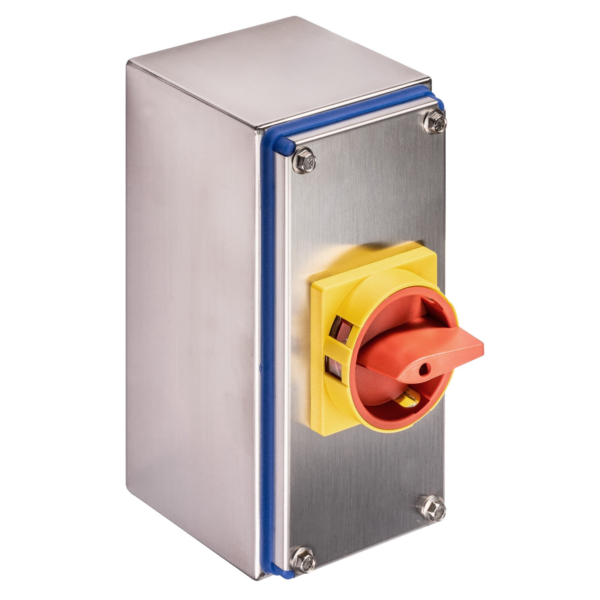 Kraus & Naimer sikkerhedsafbryder til ekstra barske miljøer, 80A, 4 polet + 1NO/NC, IP66 front, rød/gul håndtag i rustfri stål kabinet. Det kompakte design, beskyttelsesklasse IP66 og slagfasthed IK08 er ideelle til installation på trange steder og under ugunstige forhold ved miljøpåvirkninger.