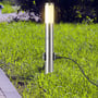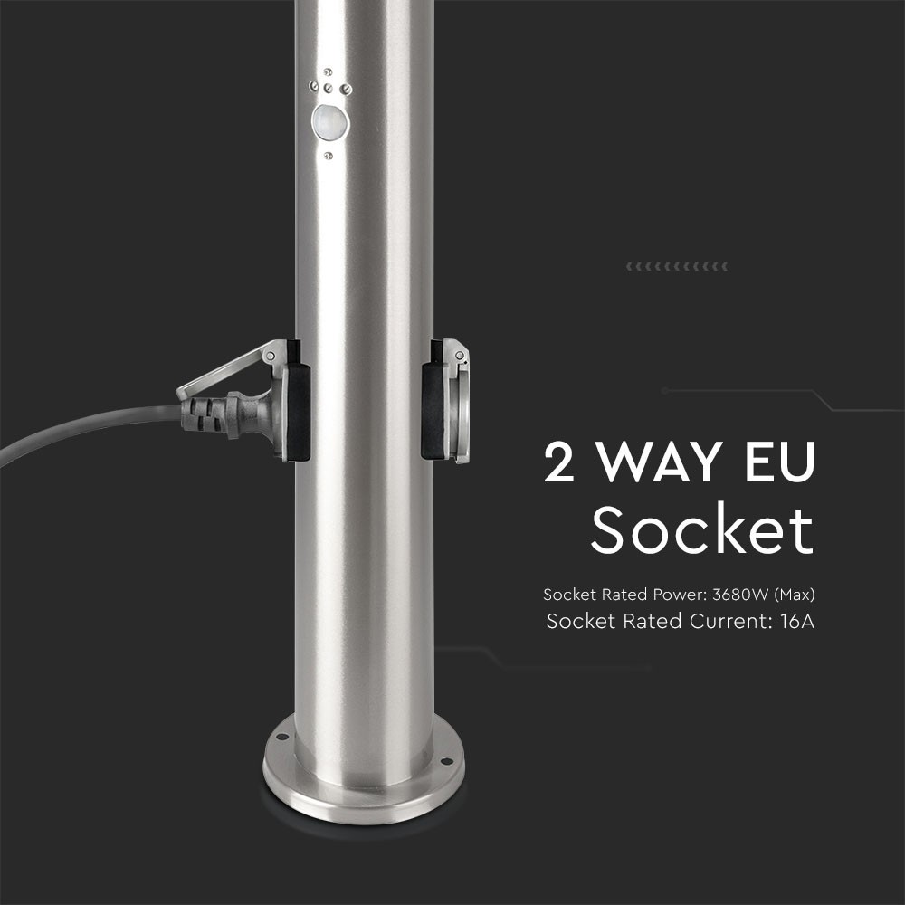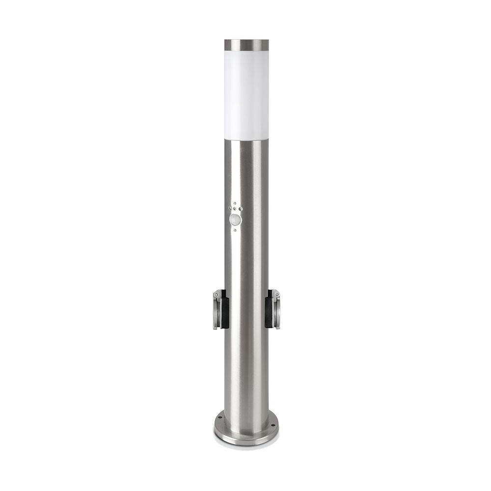 Stilfuld 60cm havelampe i rustfrit stål med E27 fatning, PIR sensor og 2 Schuko udtag. IP44 klassificeret.