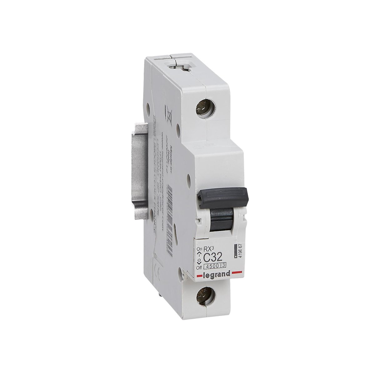 RX3 MCB automatsikring til termisk beskyttelse af installationer. Maks. kortslutningsstrøm på 6000A. C32, 1-polet, 1M, 4500A.