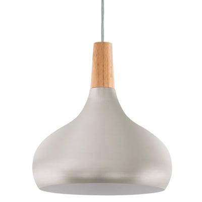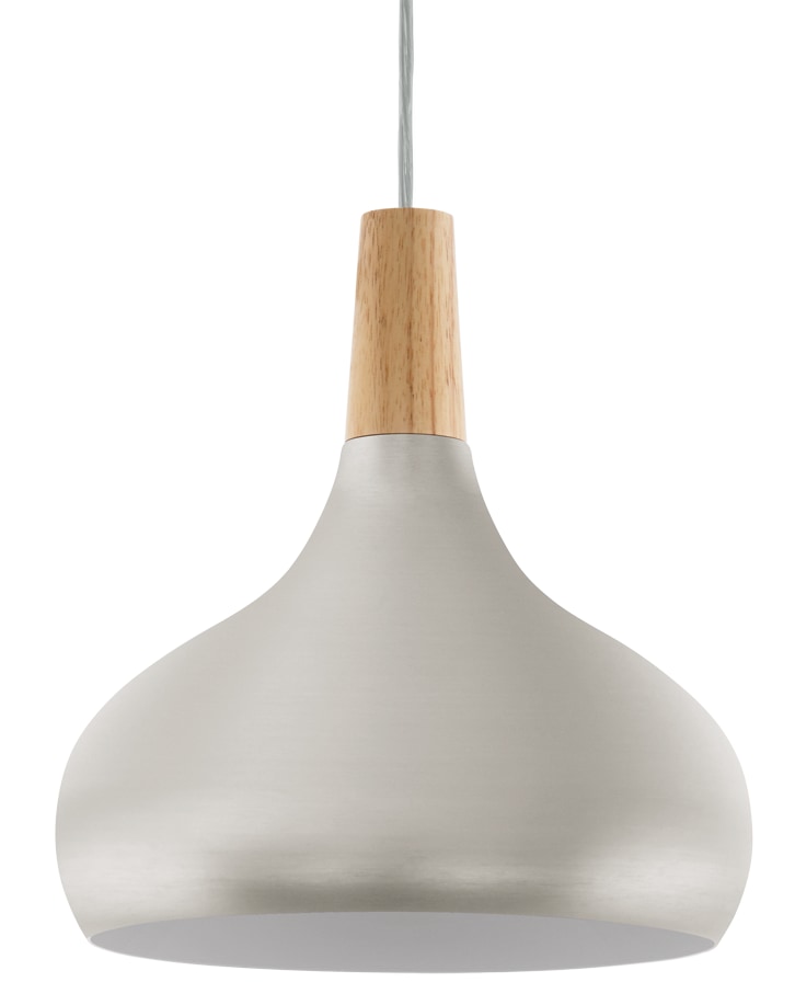 EGLO Sabinar pendel i stål og træ med skærm i børstet sølv. Ø28 cm, højde 110 cm. E27 fatning, maks 60W. Leveres ekskl. lyskilde.