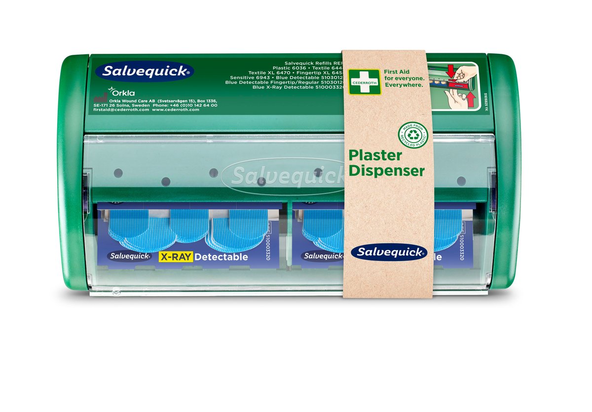Salvequick Plasterautomat X-Ray Detectable med blå røntgen- og metalldetekterbare plastre er særligt beregnet til brug inden for fødevareindustrien. I Salvequick Plasterautomat trækkes plastret nedad, hvilket forhindrer tilsmudsning af de resterende plastre.