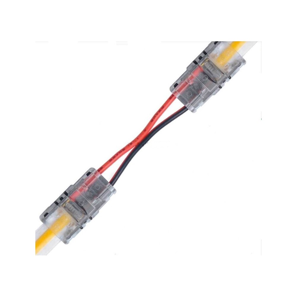 Denne samler med integreret ledning er designet til 8mm brede LED strips. Den er ideel til COB (Chip-on-Board) og enkeltfarvede LED strips, hvor der ønskes en nem og sikker forbindelse.