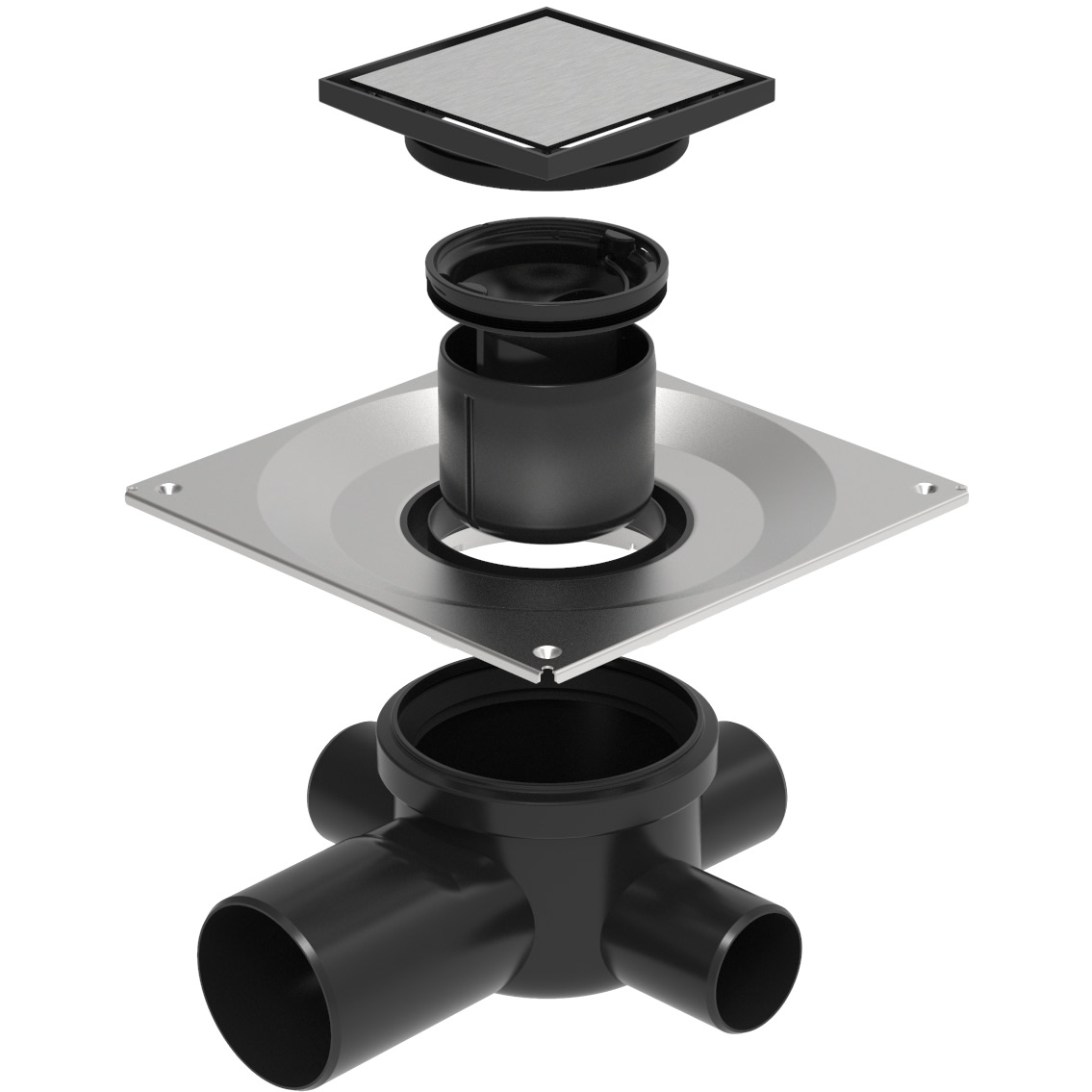 Komplet monteringspakke til HighLine Custom kvadratisk afløb med 10x10mm Custom-base, stålarmatur og vandlås. Inkl. reduktioner, speciallim, krog og renseserviet.