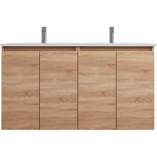 Sanibell Online møbelsæt i bardolino eg (121x46 cm) med dobbelt porcelænsvask, overløb og hanehul. Inkl. to møbler med 2 grebsfrie softclose låger og justerbar hylde.