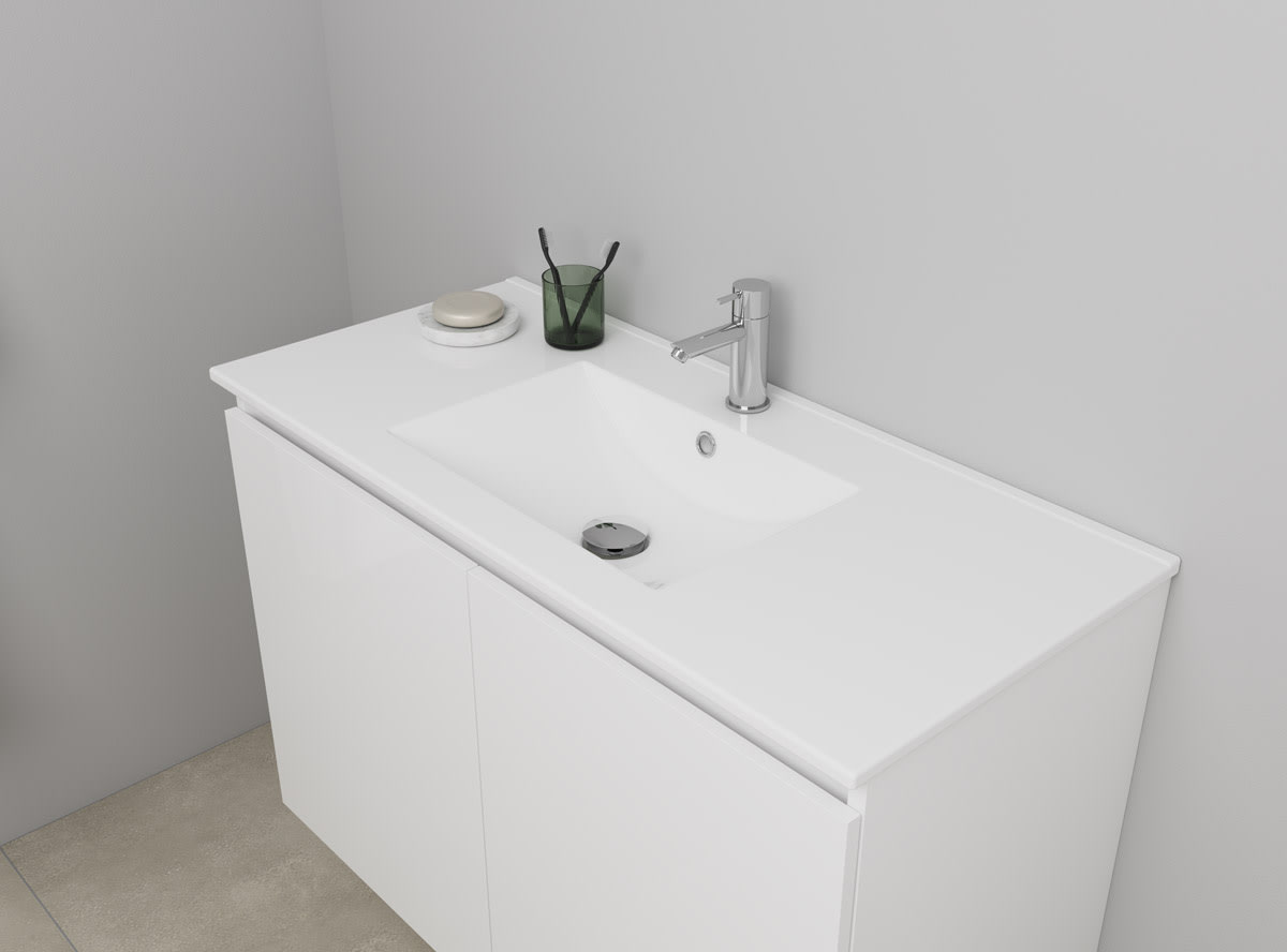 Sanibell Online møbelsæt, 101x46,5 cm, lakeret hvid højglans. Leveres usamlet som flatpack. Med porcelænsvask, overløb, hanehul og møbel med 2 grebsfrie låger og 1 hylde.