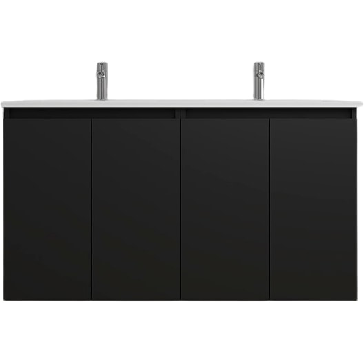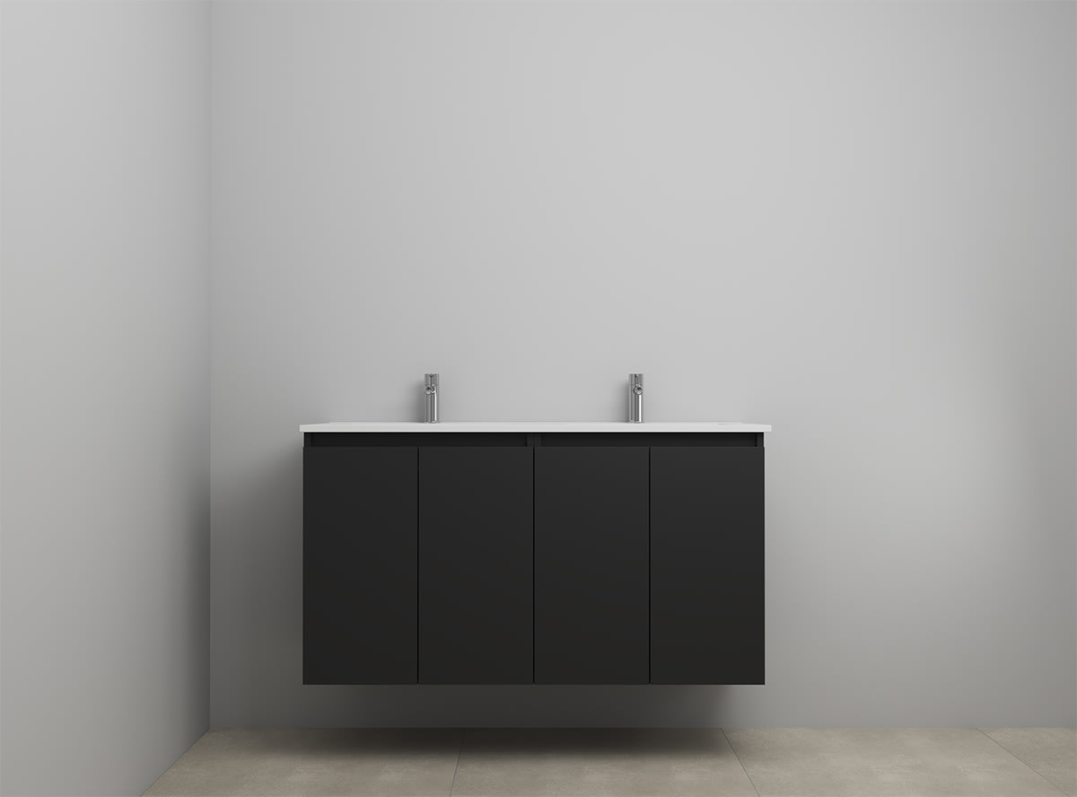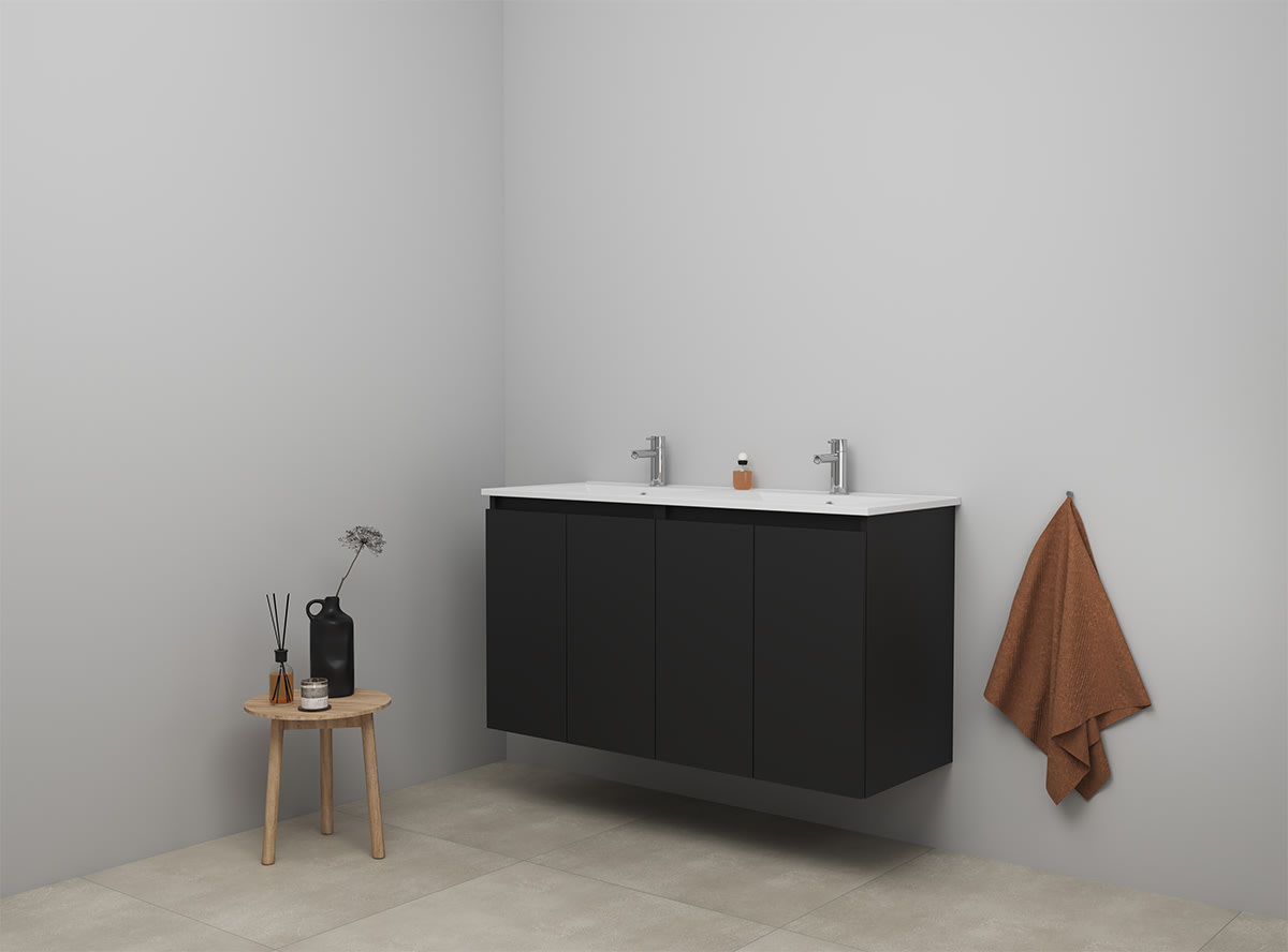 Sanibell Online møbelsæt i 121x46,5 cm, matsort, leveres usamlet som flatpack. Sættet består af en dobbelt porcelænsvask med overløb og hanehul samt to usamlede møbler med hver 2 grebsfrie softclose låger og 1 hylde.