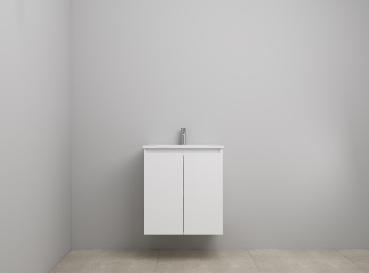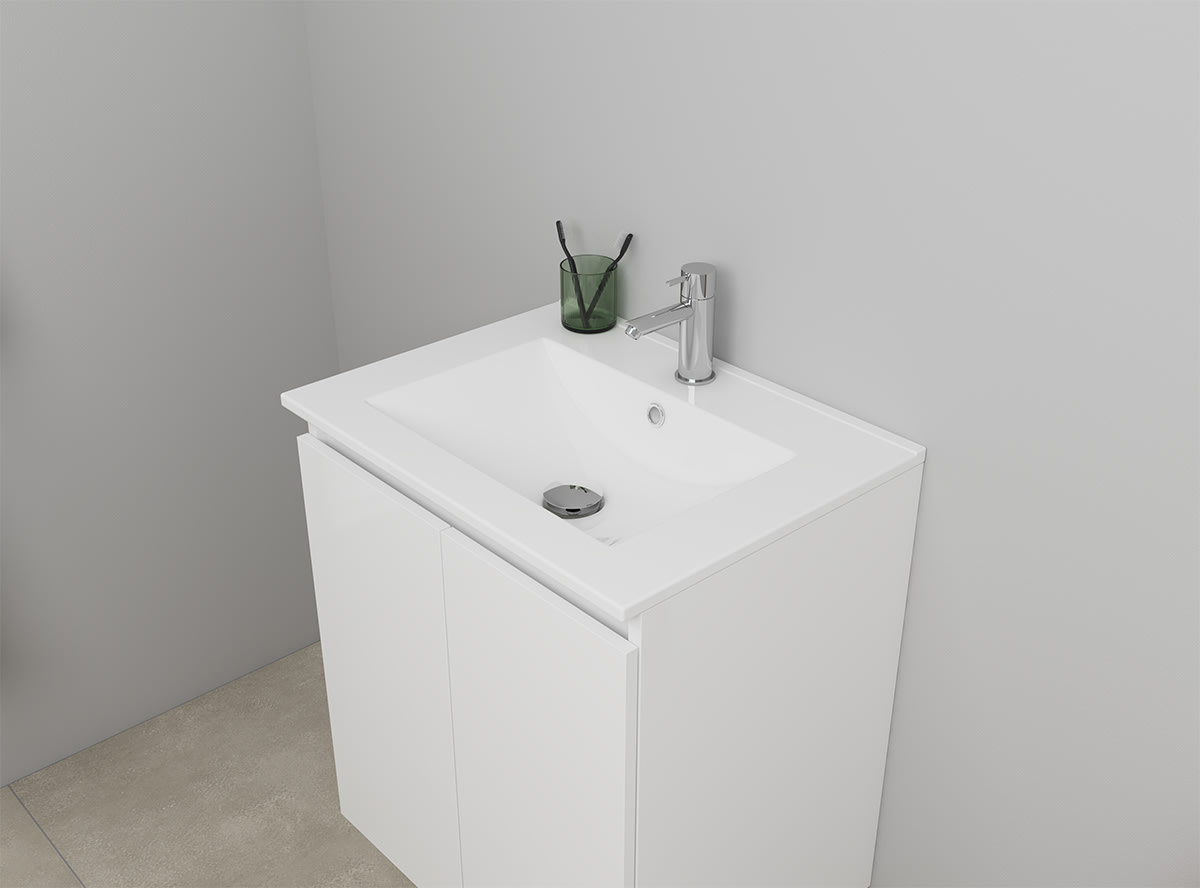 Sanibell Online møbelsæt i hvid højglans. Møbelsættet måler 61x46 cm og leveres usamlet med porcelænsvask, overløb, hanehul og et møbel med 2 låger.