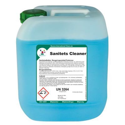 Sanitets Cleaner er et koncentreret, surt rengørings- og afkalkningsmiddel, der er velegnet til en lang række rengøringsopgaver. Produktet er dog ikke egnet til brug i kaffemaskiner og lignende.