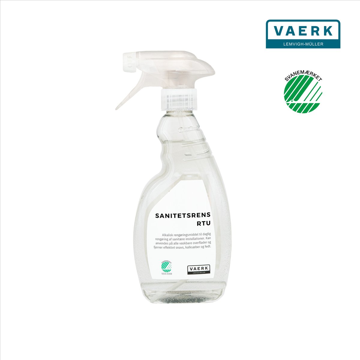 Klar-til-brug sanitetsrens til badeværelser. Svanemærket for sikret hygiejne og miljøvenlig rengøring.