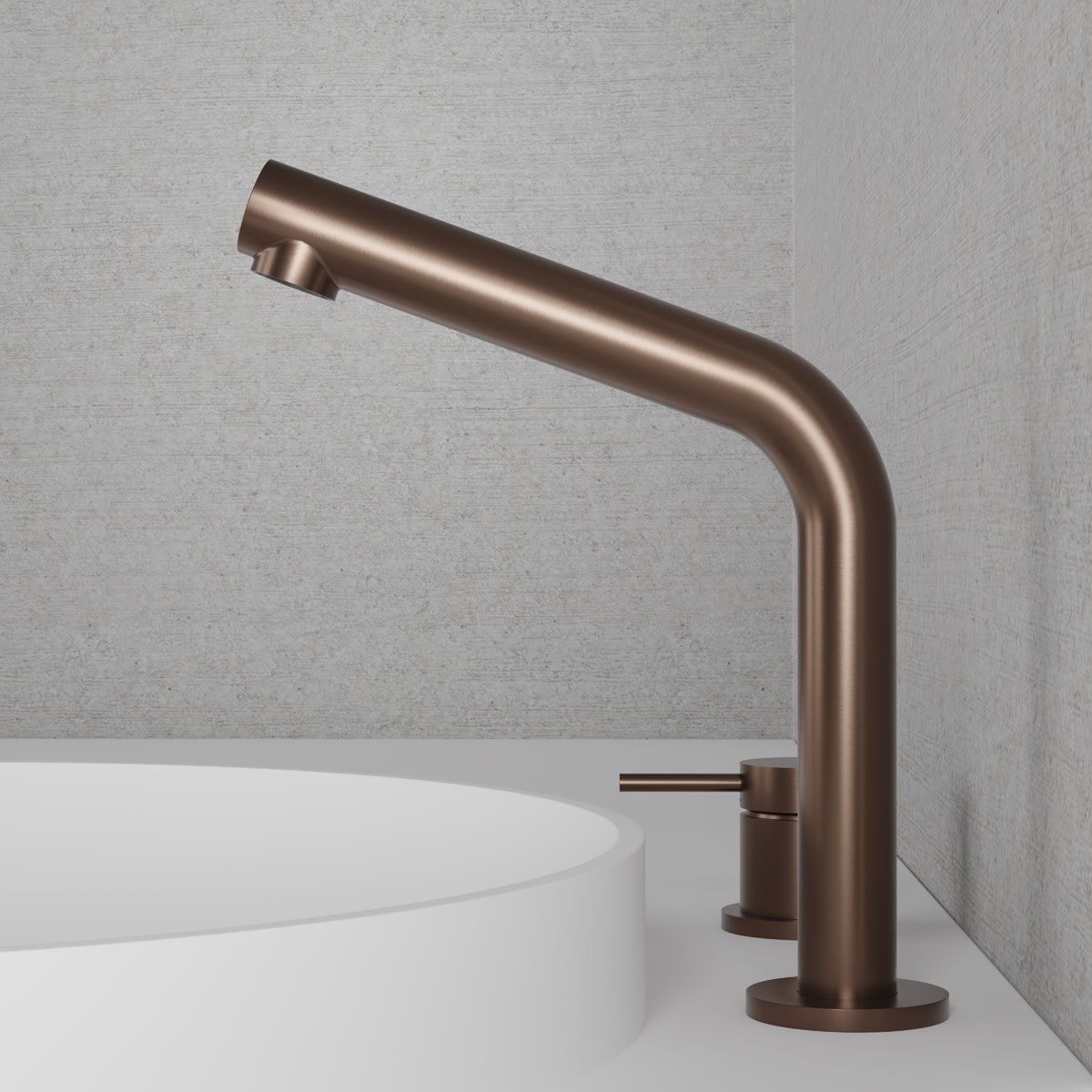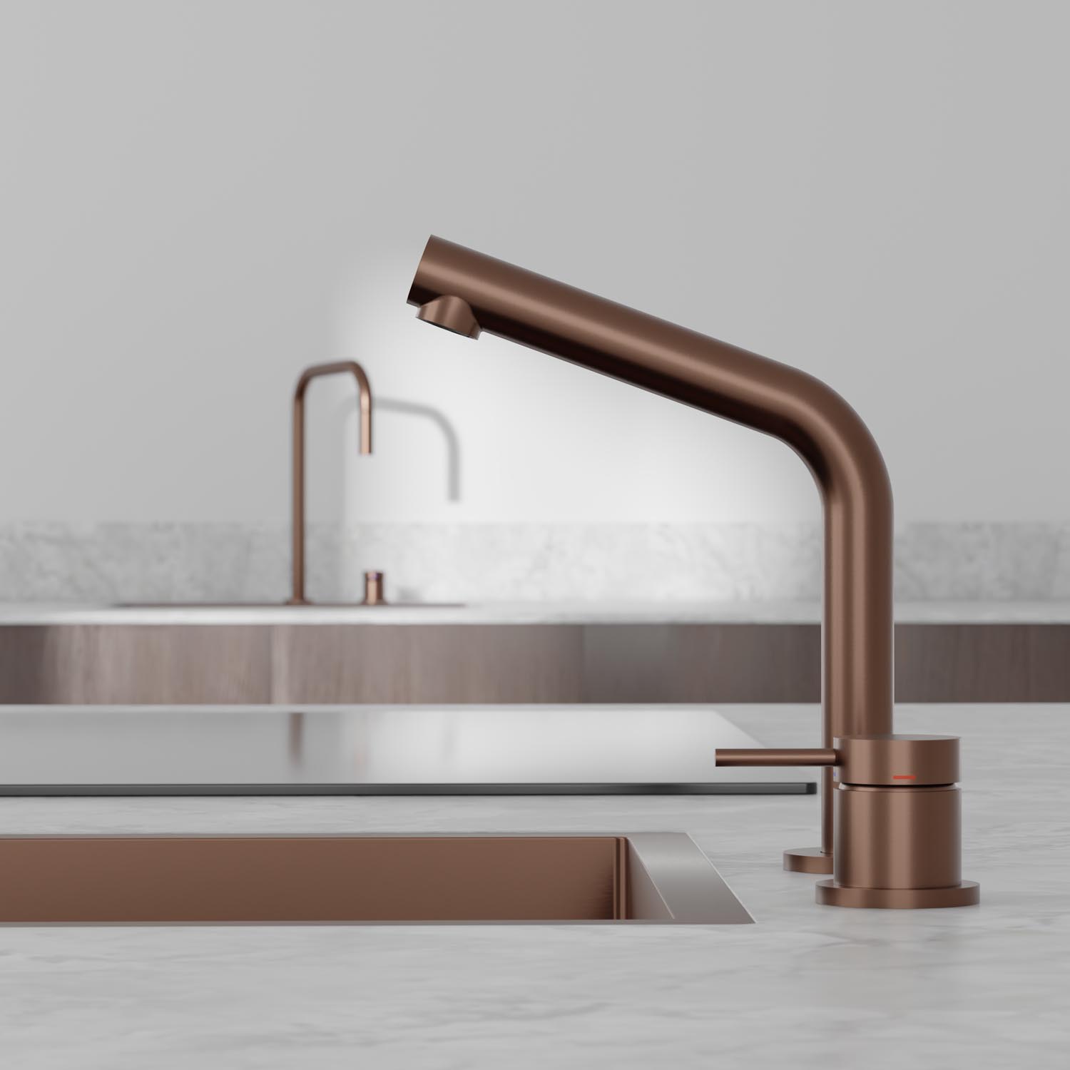 Elegant håndvaskbatteri i rustfrit stål med kobberfinish. 1-grebs betjening og svingbar tud. Vandbesparende med 4.8 l/min.