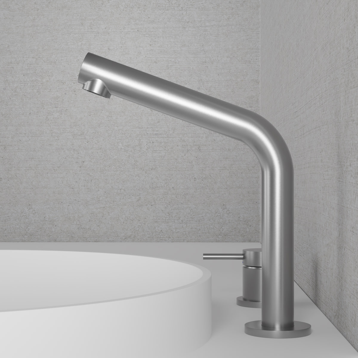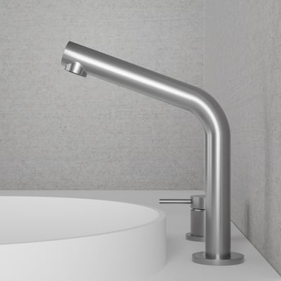 Elegant 1-grebs håndvaskbatteri i rustfrit stål fra Scandtap, med svingbar tud og vandbesparende funktion. Ideelt til bord- eller vaskmontering.