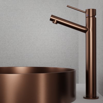 Elegant håndvaskbatteri i rustfrit stål med kobberfinish. 1-grebs betjening og bordmontering. Forbrug på 7.8 l/min.