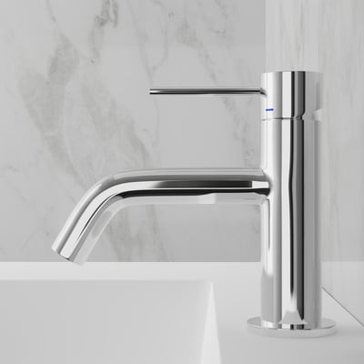 Scandtap Voyage Classic håndvaskbatteri i rustfrit stål. 1-grebs betjening, blank overflade. Til montering på bord/vask.