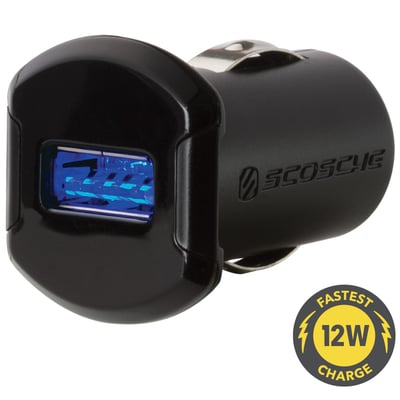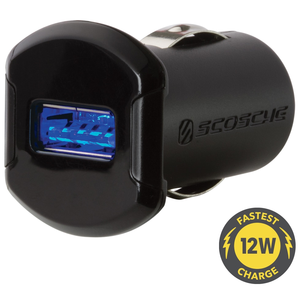 Lille og kraftfuld Scosche reVOLT™ biloplader med 1 USB stik. Hurtig opladning af telefon/iPad med 12 watt (2,4 A) udgangseffekt. Passer til iOS og Android enheder.