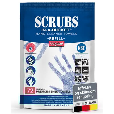 Servietterne er let tilgængelige og ideelle, hvis du ikke har direkte adgang til vand og sæbe. Scrubs® har en blød og en grov side. Den grove side fjerner genstridigt snavs på værktøj, maskiner, malede overflader, vinyl og plastik uden at ridse overfladen. Den bløde side bruges til rengøring af hænderne, som efterlades rene, bløde og velduftende.
