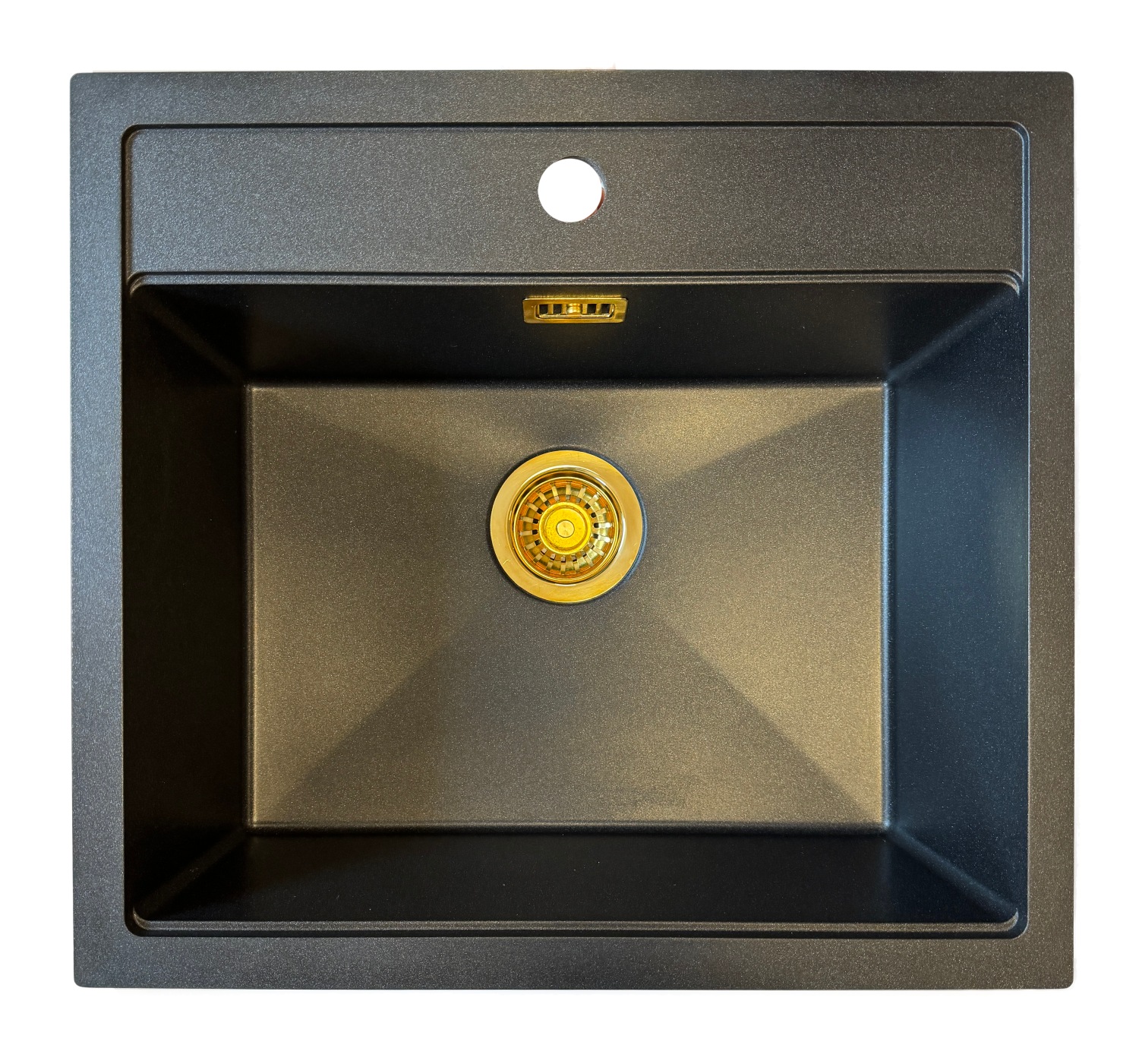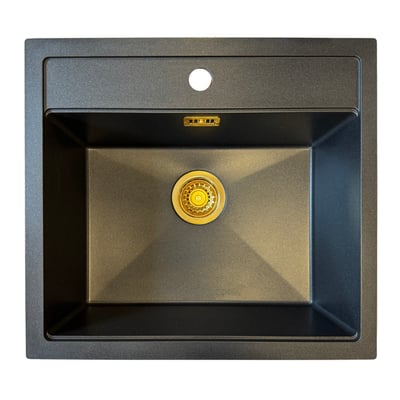 Denne firkantede Secher køkkenvask er udført i sort komposit (granit) og designet til nedfældning i et køkkenskab med en bredde på 600 mm.