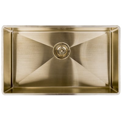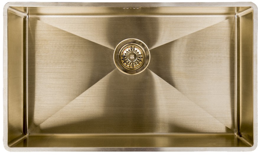Firkantet messing køkkenvask med hanehul og kurveventil. Mål: 728x428x180 mm. Til skabsbredde 800 mm.