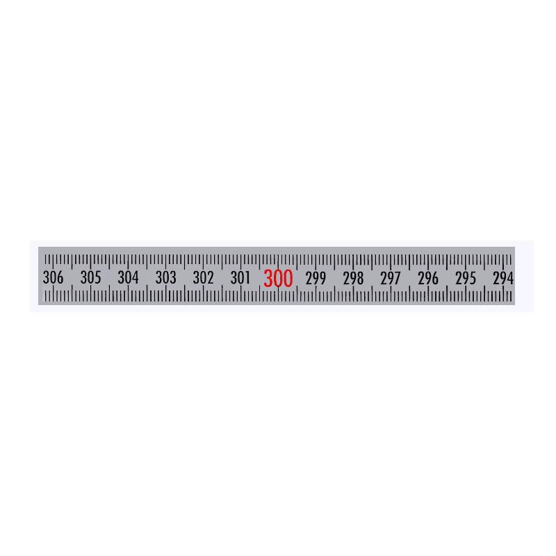Selvklæbende stålbåndmål, 5 meter x 13 mm, med dobbeltsidet tape. Graderet fra højre mod venstre med mm og cm. Sort graduering i top og bund. Løbende cm med sorte tal og meter med røde.