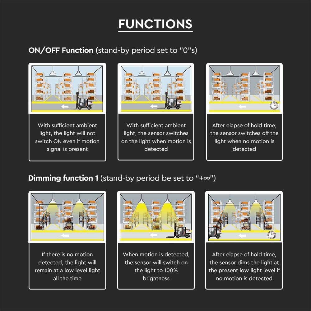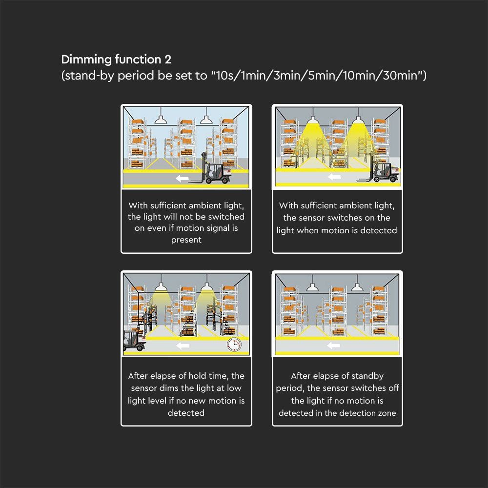 Effektiv mikrobølge sensor til high bay belysning. IP65-klassificeret, 1-10V dæmpbar og 360° dækning. Med en levetid på 50.000 timer.