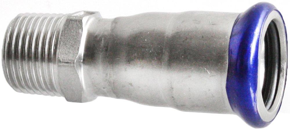 Unico rustfri overgangsnippel med udvendigt gevind og pressmuffe. Bruges til gevindsamlinger i ventiler og lignende. Godkendt til drikkevand.