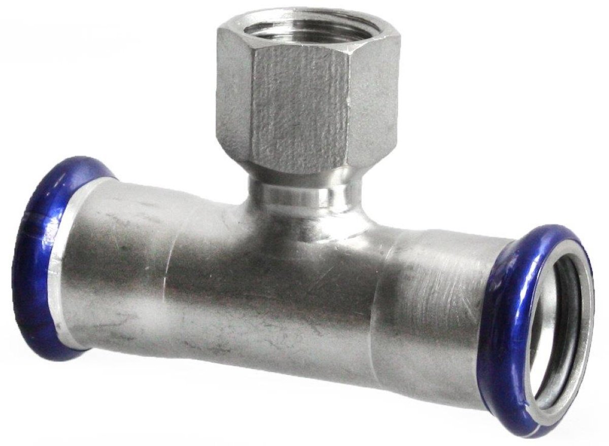 Unico rustfrit T-stykke med pressmuffer og indvendigt gevind på afgrening. T-stykket bruges f.eks hvor overgang til gevindsamling skal foregå direkte i T-stykket.