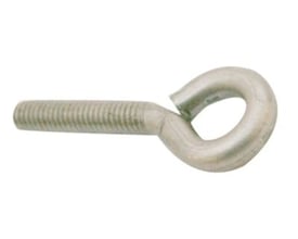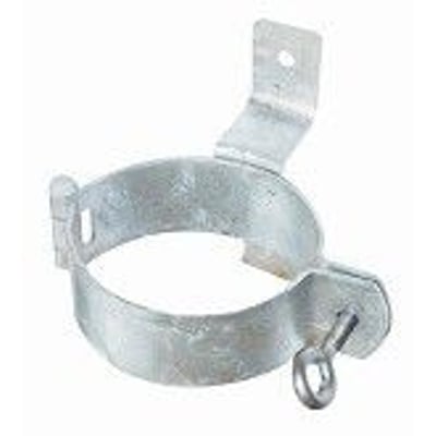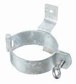 Galvaniseret hængselsstift på 100 mm til træ. Ideel til fastgørelse af nedløbsrør. Med en afstand på 35 mm fra væg til kant af bøjlen og inkluderet øjeskrue.