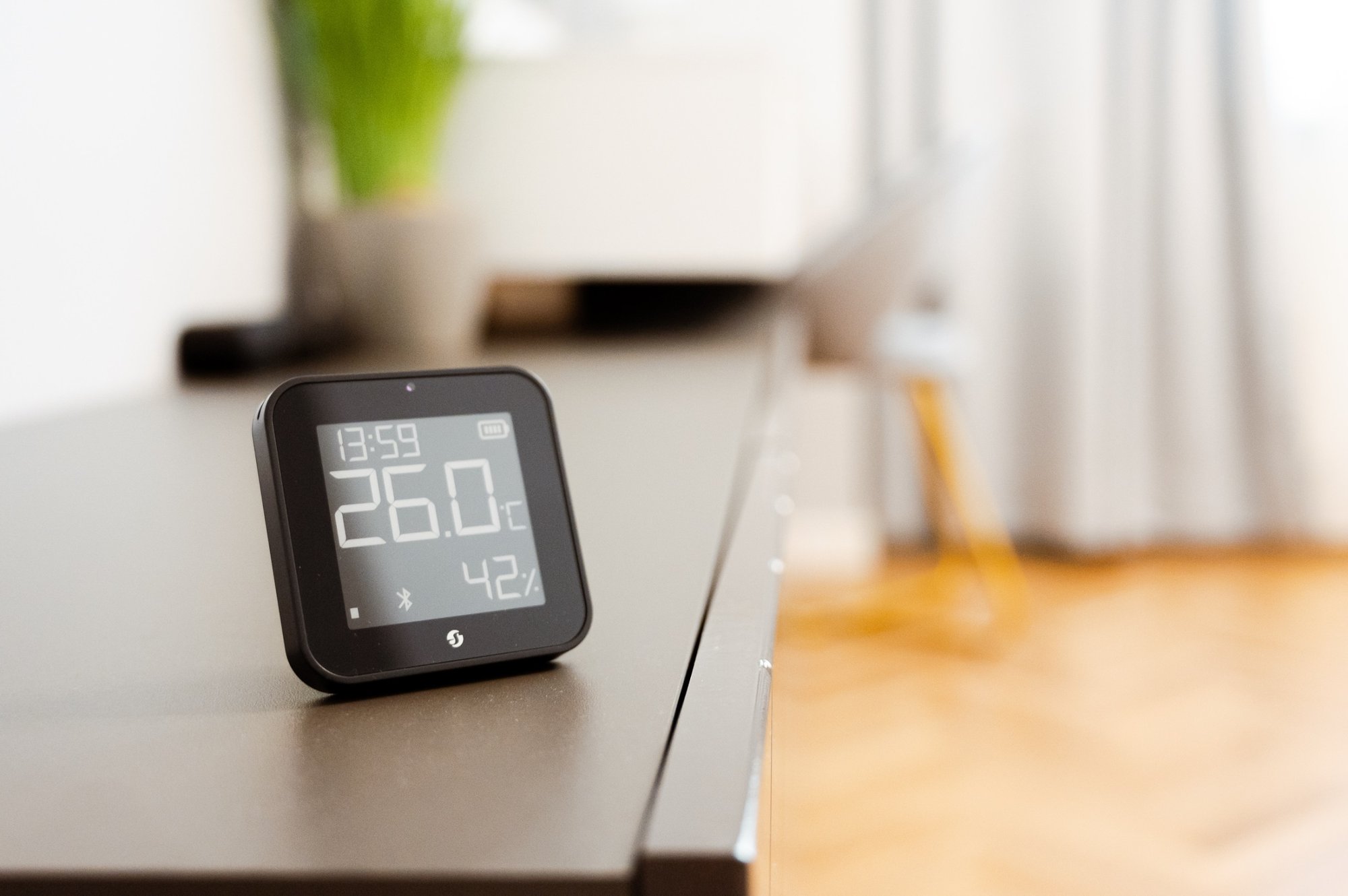 Med en størrelse på kun 65 x 65 x 9 mm (uden stander) er sensoren diskret og kan monteres med dobbeltklæbende tape eller placeres på et bord ved hjælp af den medfølgende stander. Installationen er enkel og tager kun få minutter.