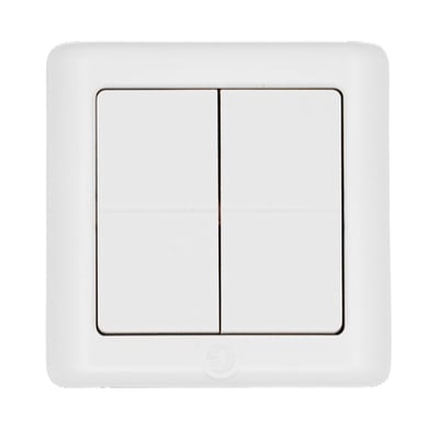 En batteridrevet vægkontakt med fire knapper, designet til dansk standard vægmontering. Kontakten leveres med en ramme og dobbeltsidet tape til direkte montering på overfladen. Rammen kan fjernes for integration i eksisterende afbryderprogrammer.