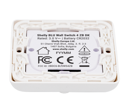 Shelly BLU Wall Switch 4 ZB DK er en batteridrevet vægkontakt med fire knapper, designet til dansk montage. Den leveres med en ramme og dobbeltsidet tape til direkte montering på overfladen, og rammen kan fjernes for integration i eksisterende afbryderserier.