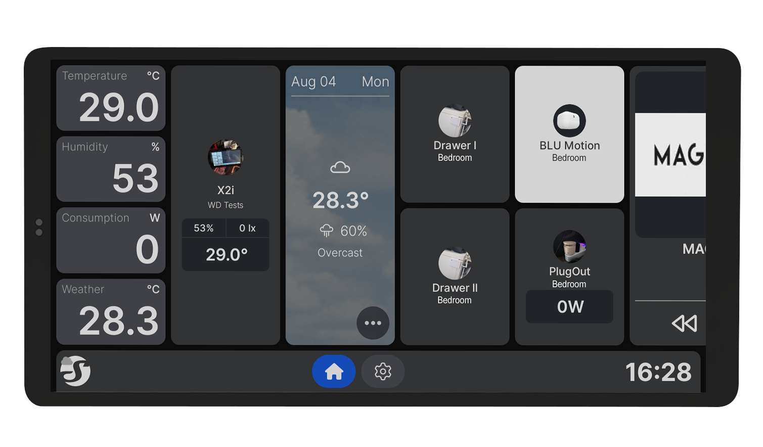 Shelly Wall Display X2i er et avanceret 6.9" touchscreen, designet til professionel styring af smart home og bygningsinstallationer. Den giver direkte kontrol af belysning, opvarmning, solafskærmning og Sonos/Bluetooth-højttalere. Som efterfølger til Wall Display X2, fås den med en ramme i sølv (aluminium) eller sort. Enheden passer i en standard europæisk vægkontaktboks (vandret eller lodret) og kræver kun 230 V, men kan også forsynes via USB-C ved overflademontering.