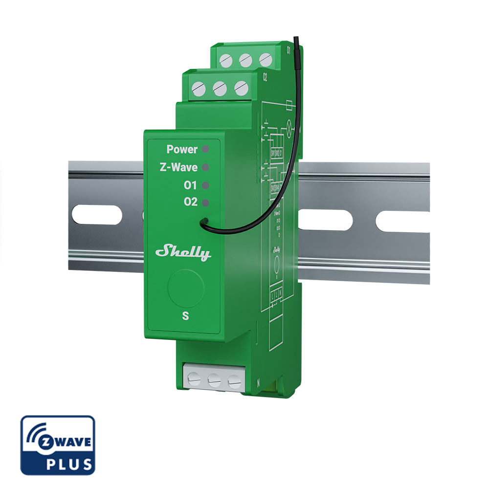 Shelly Wave Smart Dimmer er en DIN-skinne monterbar, to-kanals smart lysdæmper, der integreres problemfrit med Z-Wave® hjemmeautomatiseringssystemer for fjernstyring.