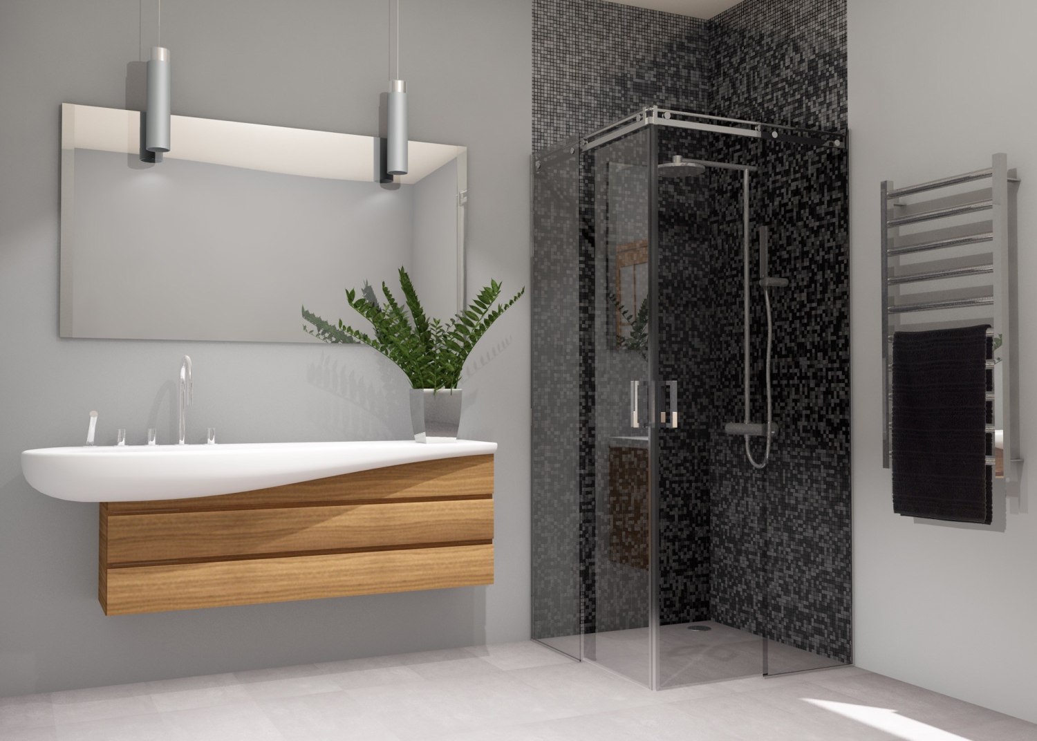 Vesta brusekabine med sorte profiler og klart 6 mm glas, designet som hjørne med væg og dør. Måler 90x90x200 cm og er vendbar for fleksibel montering.
