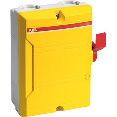 Denne sidebetjente sikkerhedsafbryder er designet til at forhindre utilsigtet start af motorer eller elektriske anlæg under service og eftersyn. Den er udført i en lysegrå kunststofkapsling med en markant rød/gul dækning, hvilket gør den let at identificere.