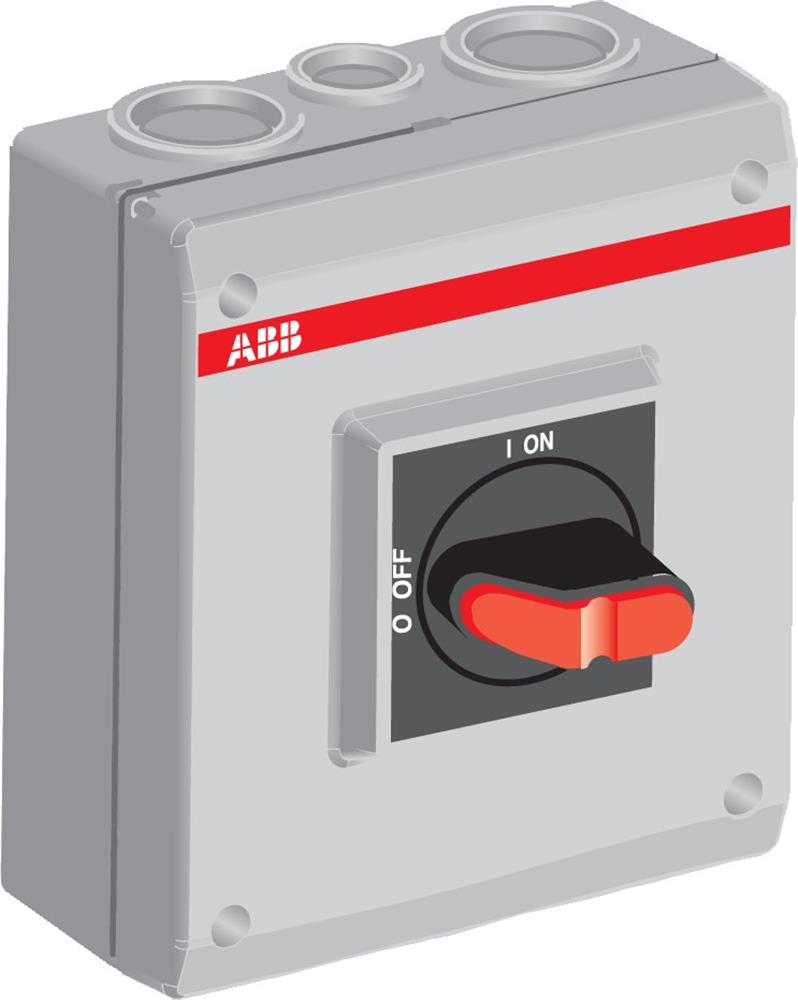 Denne frontbetjente sikkerhedsafbryder fra ABB er designet til at forhindre utilsigtet start af motorer eller elektriske anlæg under service og eftersyn. Den er udført i en grå kunststofkapsling og har et sort greb for nem betjening.