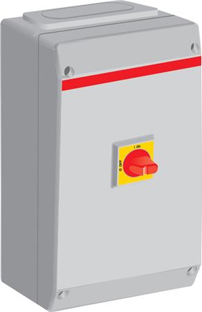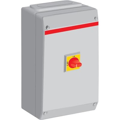 Sikkerhedsafbryder 80A, 3-polet med rød/gul greb. Aflåselig i 0-stilling, inkl. hjælpekontakt og IP65-klassificeret for M50 forskruninger.