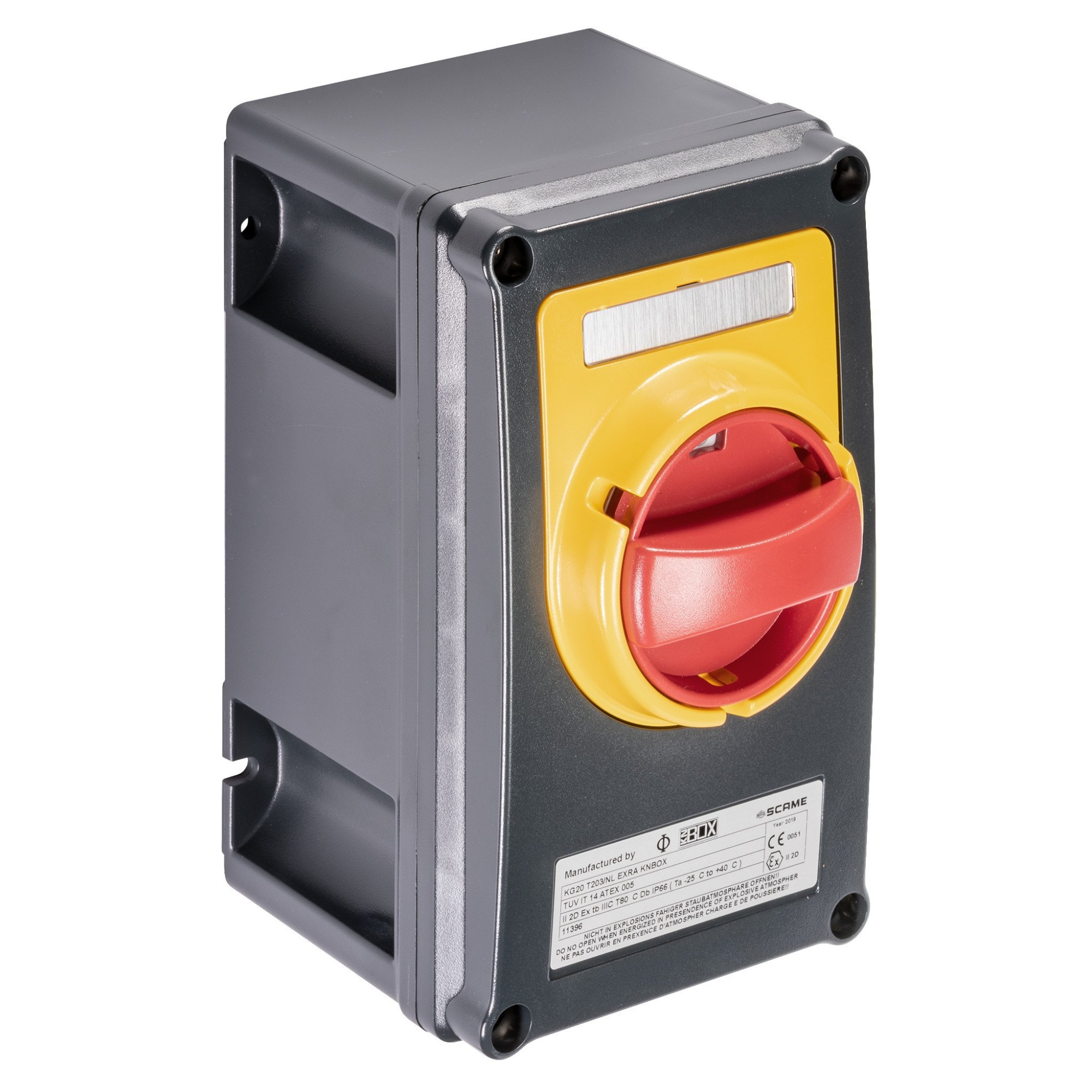 Kraus & Naimer ATEX afbryder, 32A, 6 poler + 1 NO/NC, IP66 med rød/gul greb i hård plastik kapsling. Vedligeholdelses- og sikkerhedsafbryder iht. EU ATEX-direktiv 2014/34/EU.