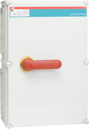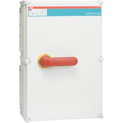 Sikkerhedsafbryder med rød/gult, låsbart drejegreb. Inkl. hjælpekontakter 2SL+2BR. Plastkapsling IP65. FL21-flange. Kabeltilgang top/bund. Størrelse: 560x380x180.