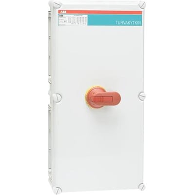 ABB OT160EVFCC3A sikkerhedsafbryder med låsbart, rød/gult drejegreb, hjælpekontakter, og IP65 plastkapsling. Ideel til sikker frakobling i krævende miljøer.