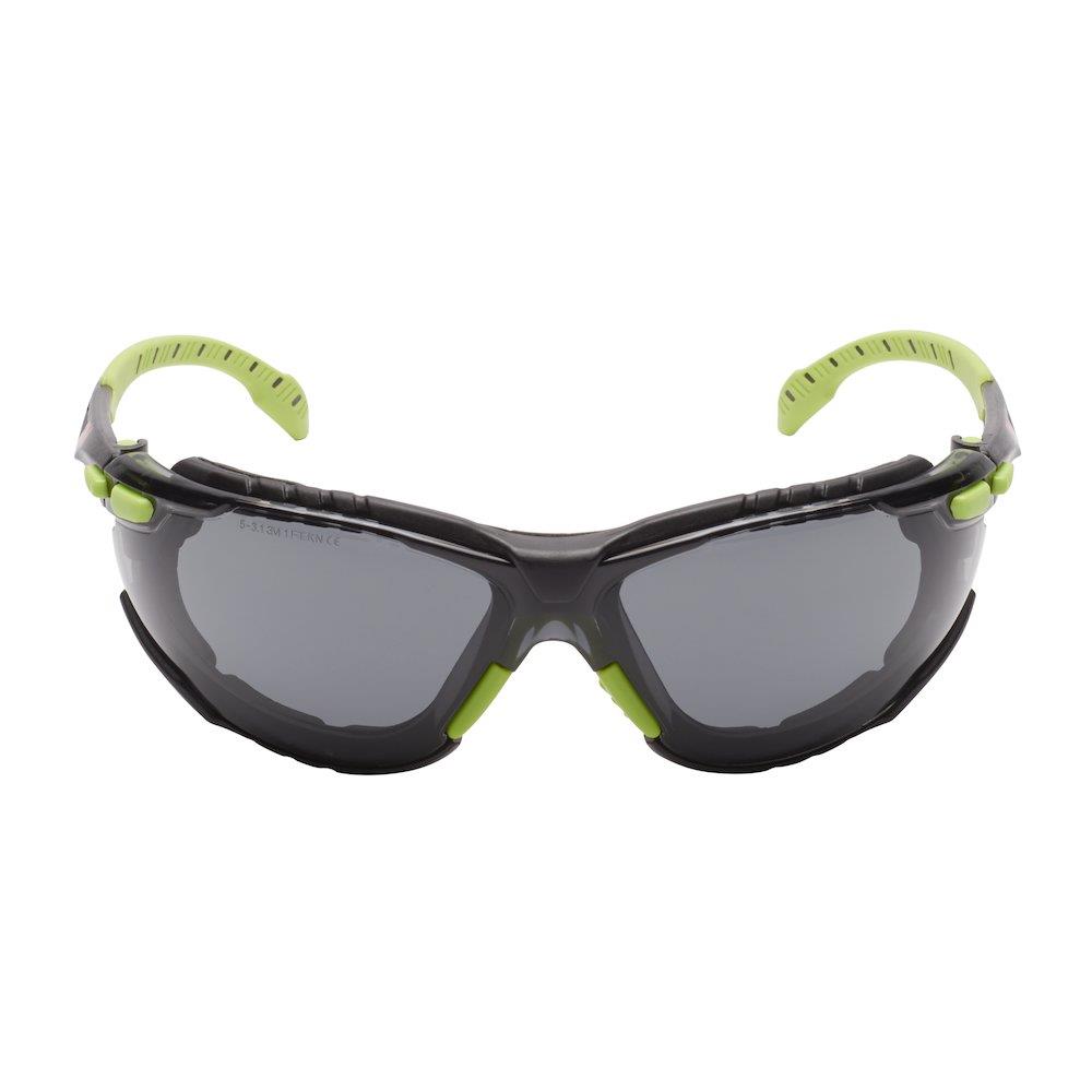 3M Solus 1000 Premium sikkerhedsbriller med stærk, gråtonet polykarbonatlinse og slankt stel. Aftagelig skumindsats forhindrer snavs i at komme i øjnene.