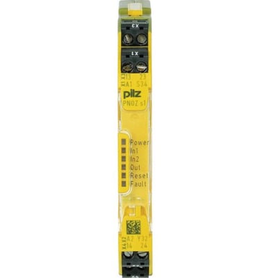 Sikkerhedsrelæ med 2 sluttefunktioner (NO), designet til brug i temperaturer mellem -10 og 55°C. Type 750101, også kendt som PNOZ s1 24VDC.
