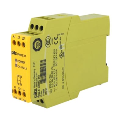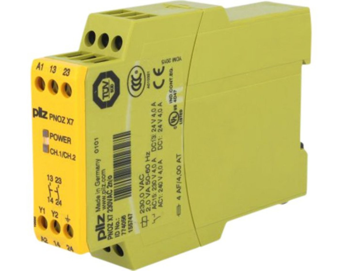 Sikkerhedsrelæ med 2 slutte (NO) kontakter, DIN-skinnebeslag, 230VAC, 4A AC og et temperaturområde på -10...55°C. Type: 774056, Alias: PNOZ X7 230VAC.