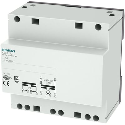 Sikkerhedstransformator fra Siemens med 40VA, primær 230V AC og sekundær 2x12 V/24 V AC. Med PTC-sikring for optimal beskyttelse.