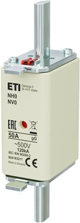 NH0 50A gG sikring til 500V AC med en brydeevne på 120kA. Overholder IEC 60269-1 og IEC 60269-2 standarder. Inkluderer statusindikator.