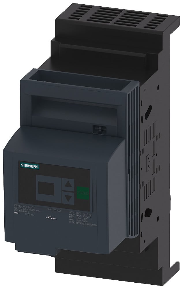 SENTRON sikringsafbryder 3NP1, 3-polet, NH000, 160 A til Rittal busbarsystem 60 mm. Med box terminal og elektronisk sikringsovervågning EFM20, dækstr. 32/70 mm.