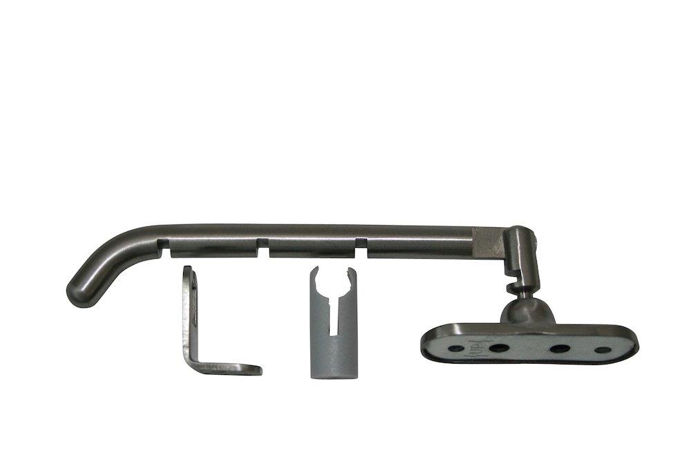 Sikringsbeslag til tophængt eller sidehængt vindue, i børstet rustfrit stål.