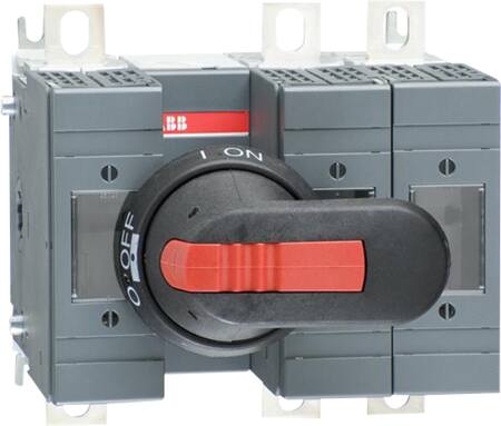 4-polet sikringsbryder OS160GD04N2P fra ABB, 160A ved 690V AC, til DIN000/00 sikringer. Med sort greb, aksel front venstre og bolttilslutning.