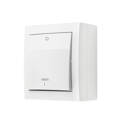Simon X4 2-polet afbryder med integreret LED-indikatorlys. Afbryderen har en spænding på 250 V~ og en strømstyrke på 10 AX. Den er IP44-klassificeret og designet med skruefiksering for nem installation. Farve: hvid.