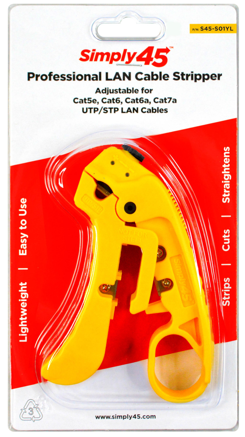 Simply45® Professional afisoleringstang er en patenteret, brugervenlig og justerbar tang, der kan bruges til både uskærmede (UTP) og skærmede (STP) netværkskabler.