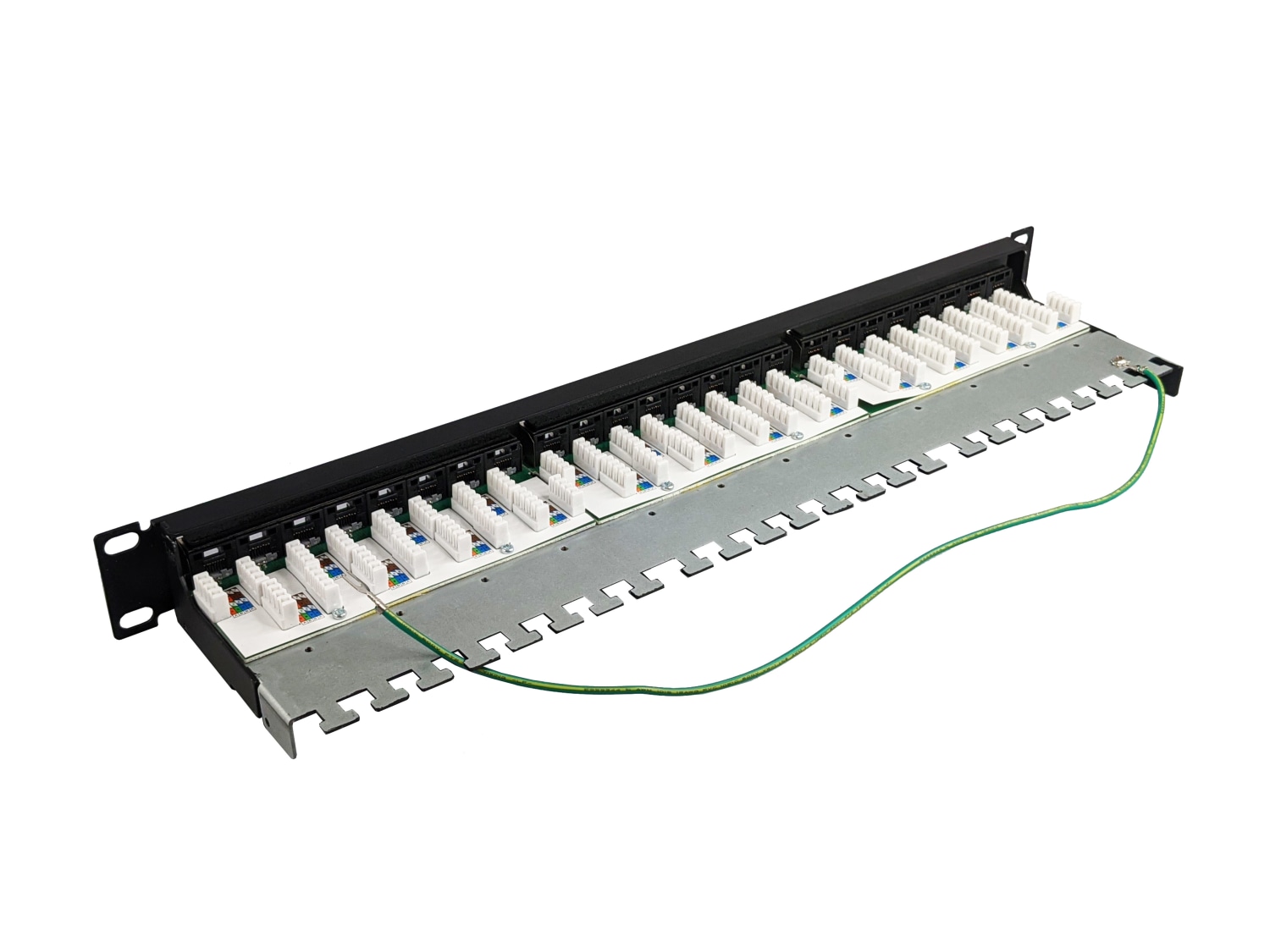 Simply45® 10GBaseT indlæst 24 port skærmet inline patch panel. Ideel til 10G skærmede kabler såsom Cat7a/7/6a ISO/IEC 11801 Class Ea. Bagudkompatibel til afskærmet: