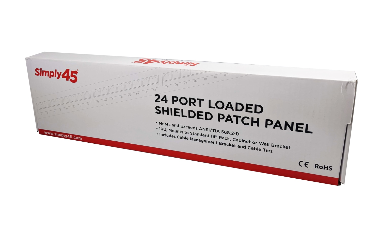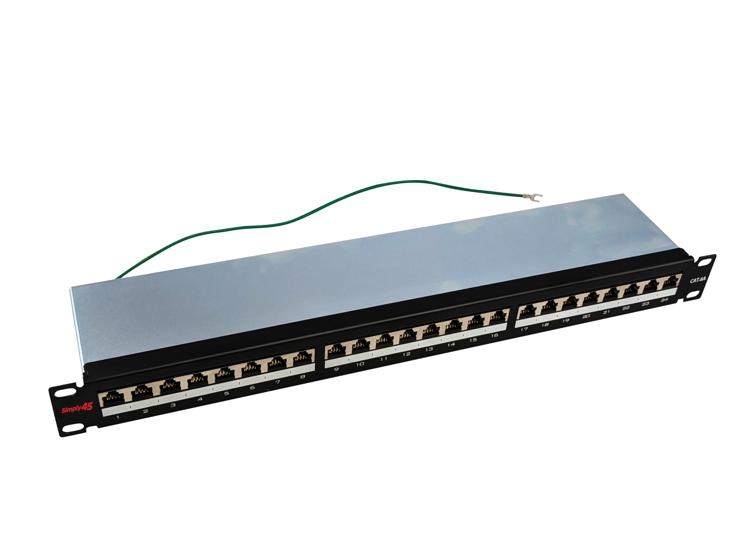 Simply45 RJ45 patchpanel med 24 porte, STP skærmet og 10G loaded. Ideel til 10G skærmede kabler som Cat7a/7/6a ISO/IEC 11801 Class Ea. Inkluderer kabelstyring og monteringshardware.